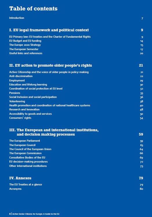 Publicatie, lansata în cadrul Anului european 2012 al îmbătrânirii active și al solidarității între generații, oferă o imagine de ansamblu a cadrului juridic al UE și politicilor care sprijină persoanele în vârstă dar și o actualizare a procesului de luare decizii UE. Ea încearcă să sensibilizeze cetățenii în vârstă cu privire la modul în funcțiile UE, cum se iau deciziile , modul în care cetățenii, inclusiv cei în etate, se pot bucura de drepturile lor și pot solicita despăgubiri atunci când acestea nu sunt respectate, precum şi modul în care acestea pot implica și influența politica UE de luare proces.